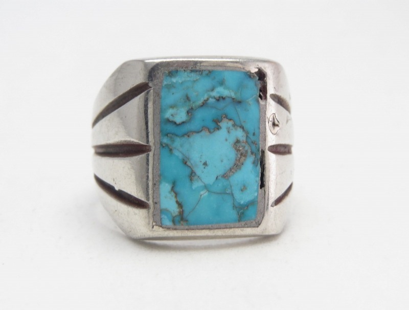 【NAVAJO】ナバホのビンテージジュエリー、キャストで成形された力強い造形をベースにして、澄んだ水色に複雑な景色を形成するマトリックスが特徴的なスクエアカットターコイズがインレイされた作品。エッジーでミニマルな造形美が秀逸なアンティーク/ビンテージリングです。