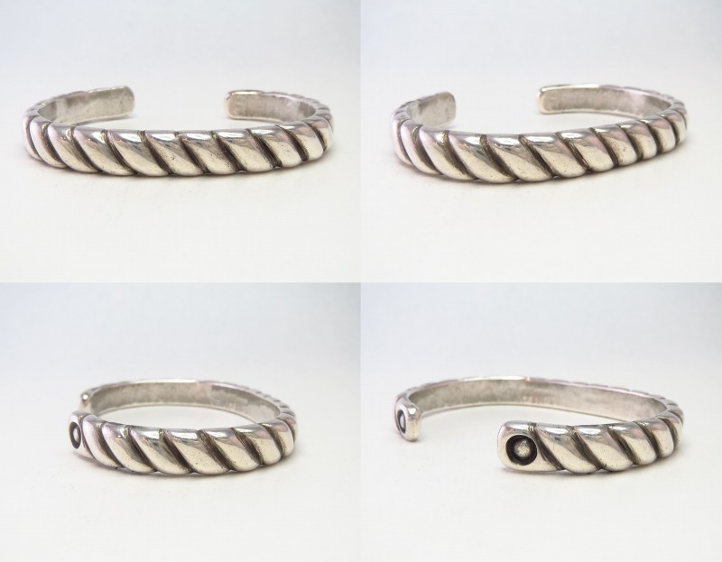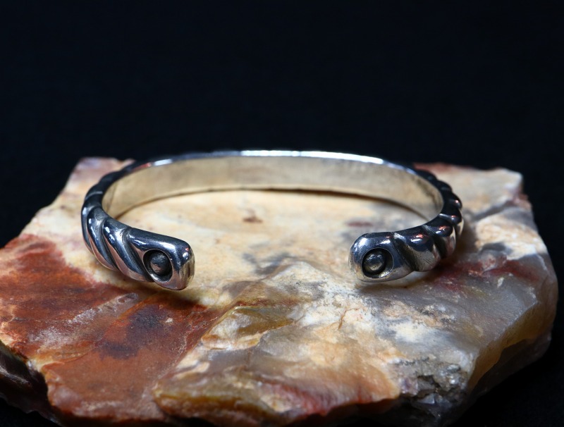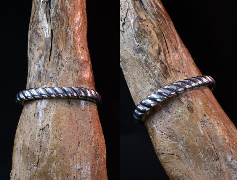 モチーフを明言することは出来ませんが、アメリカ国内では『ロープ』と言われることが多い造形スタイルで、素晴らしい造形センスにより高い完成度を持ち洗練された印象が感じられます。しかしながら、同時に伝統的なナバホジュエリー独特のシルバーワークで形作られることで粗暴な部分も見られ、ハンドメイドの趣と威厳のある表情が与えられています。