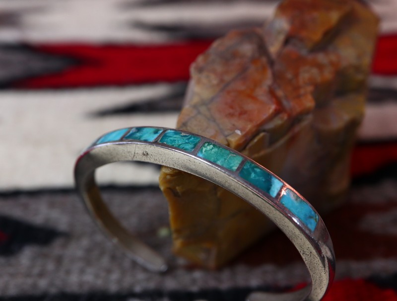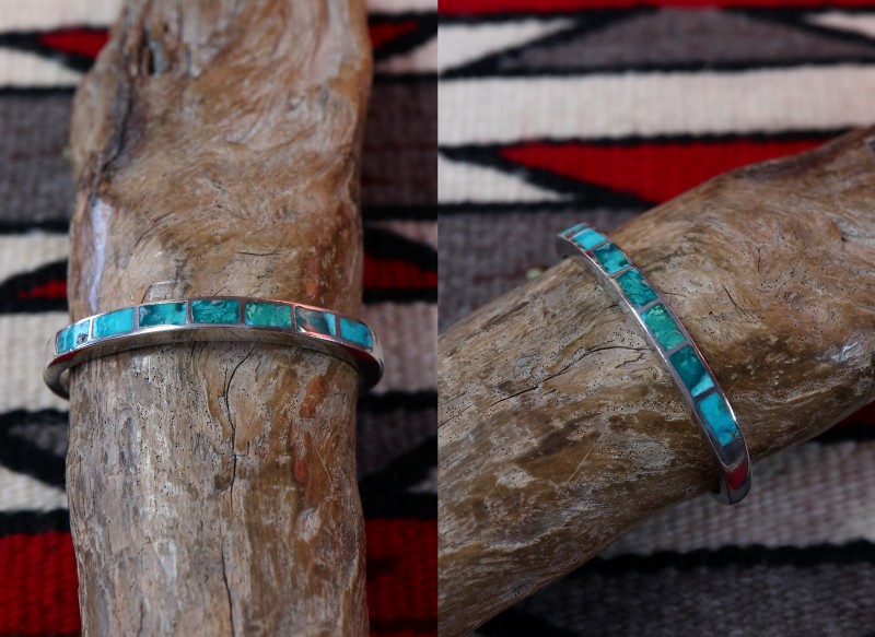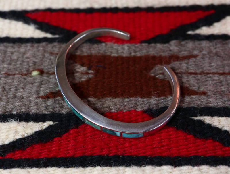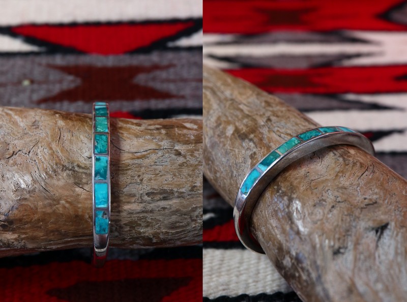 1960年代頃に作られたと思われる作品で、キャストで成形された細く分厚いバンド/地金をベースに、大変美しいグリーンターコイズのインレイが施された作品。ズニのビンテージ作品としては非常にオーセンティックなデザインのバングルですが、とても趣あるグリーンターコイズがインレイされることで、独特の奥行きとアーシーな雰囲気が与えられています。また、インレイワーク自体も隙間を埋める充填剤が非常に少ない完成度の高い仕事によって仕上げられています。
