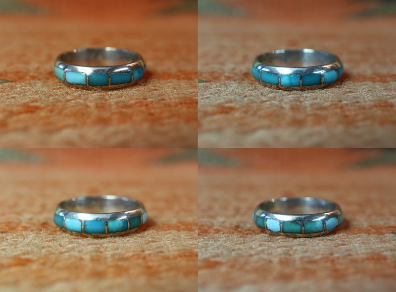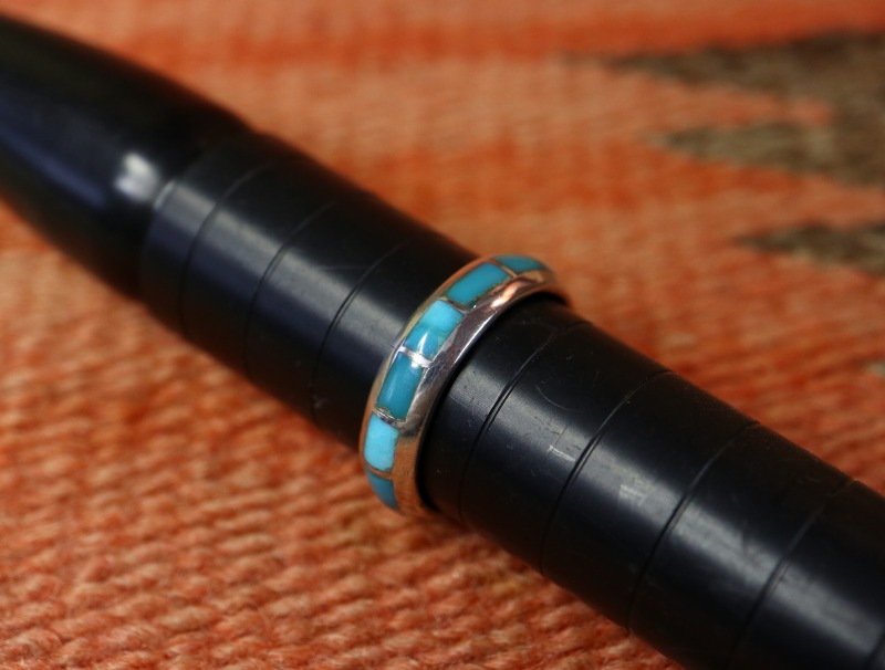 シャンクはハーフラウンドのシェイプを持ち、その半円型の断面に合わせて美しいターコイズがインレイされています。またそれは、長方形が整然と羅列されており、構築的でモダンな印象となっています。さらに、そのインレイワークはリングの円周全てに施されており、外側からはつなぎ目が発見できない仕上がりとなっており、作者の拘りと高い技術力を感じさせます。