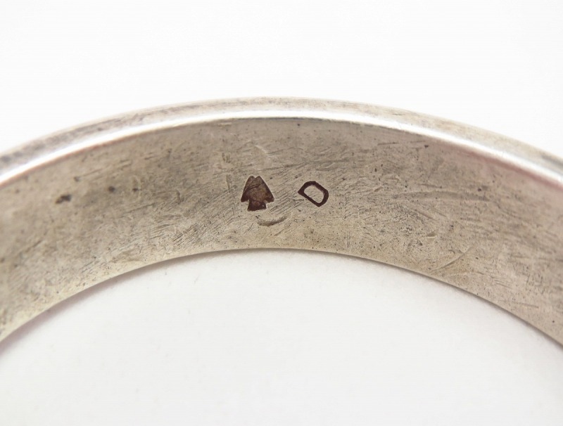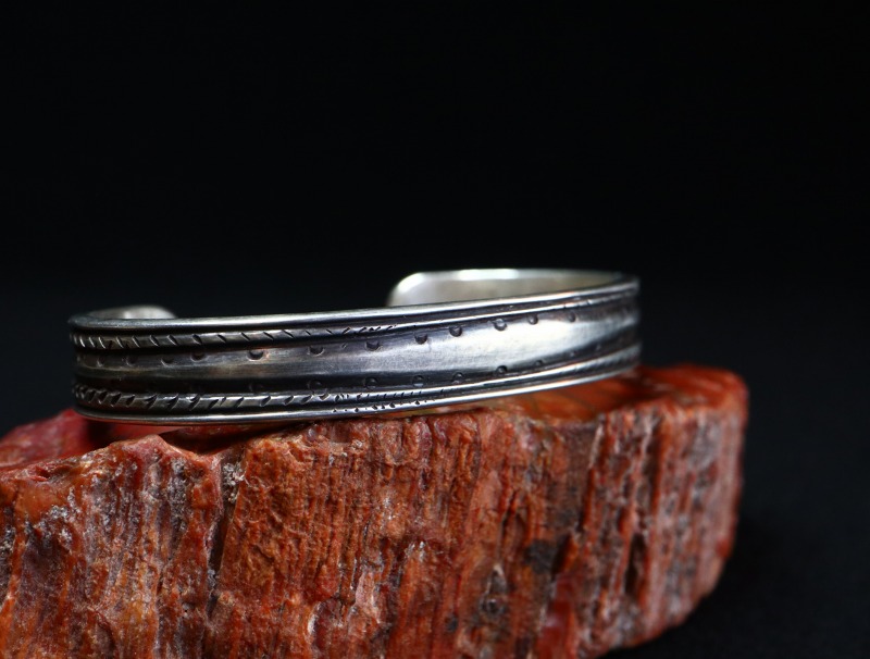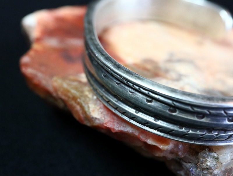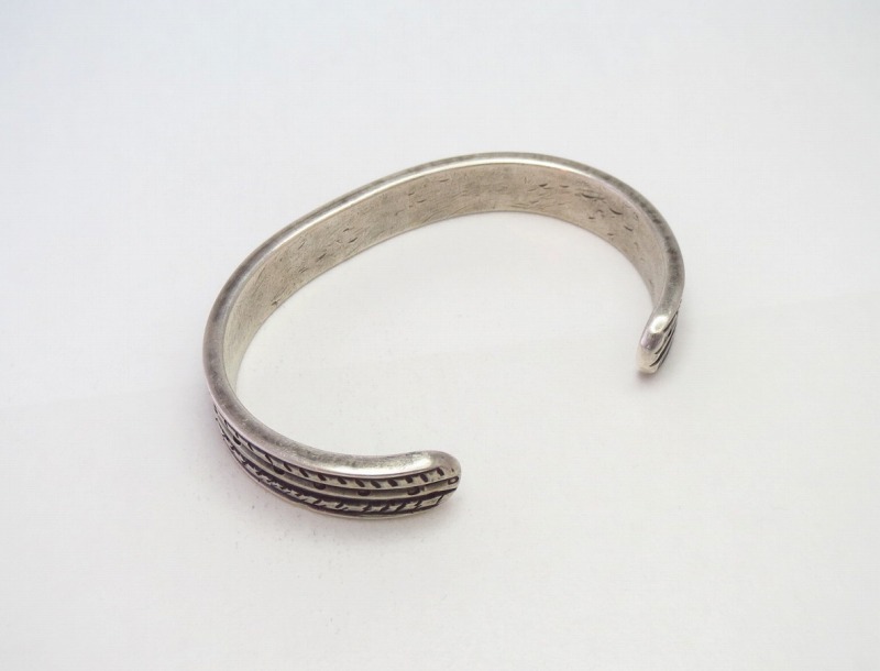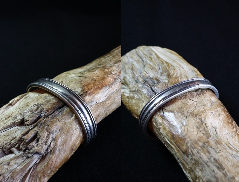 比較的細く造形されていますが、非常に厚みがあり重厚でそれなりの存在感を持ったバングルです。また、荒々しくも力強く刻まれたスタンプワークは、プリミティブながらエッジーで味わい深い表情を生み出しており他の作品との重ね付けにも向いたバングルですし、性別やシーンを問わず日常のアクセントとしてお使いいただけると思われます。