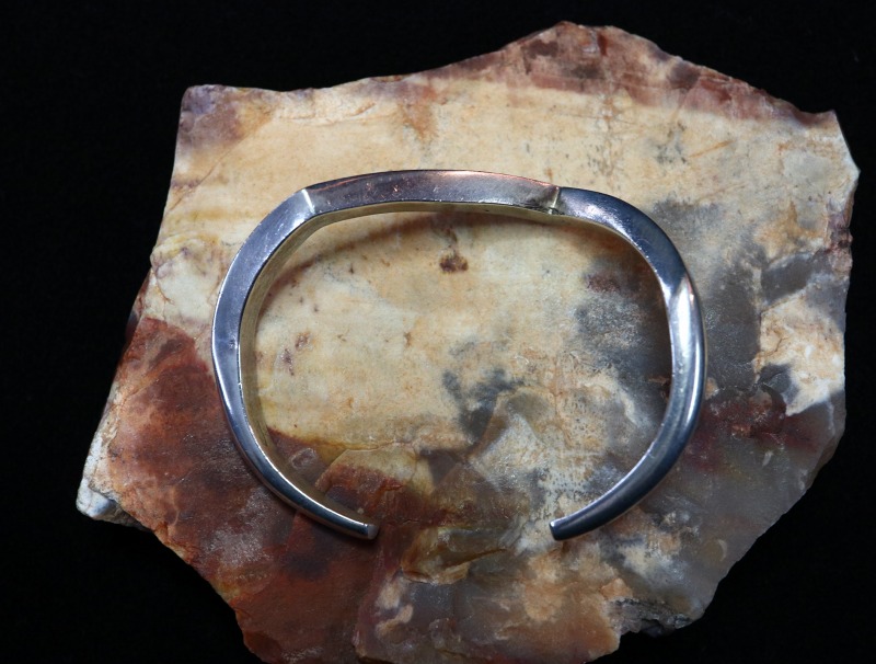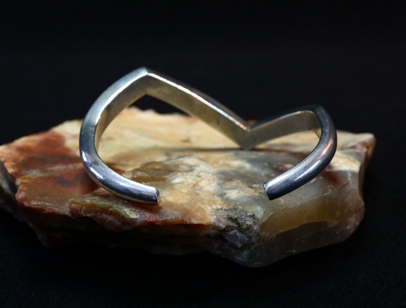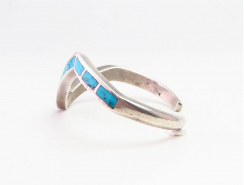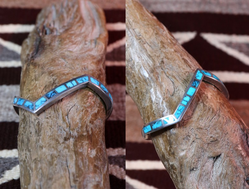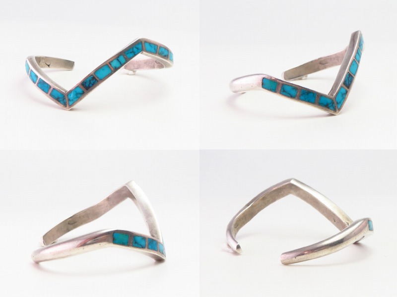 1960年代頃に作られたと思われる作品で、キャストで成形されたナローな幅ながら厚みのあるスクエアワイヤーに近いバンド/地金をベースに、大変美しいナンバーエイトターコイズのインレイが施された作品。こちらのようなジグザグに湾曲したシェイプは、稲妻/ライトニングをモチーフにしたズニのオーセンティックなスタイルの一つであり、クラシックでエレガントな印象を持っています。