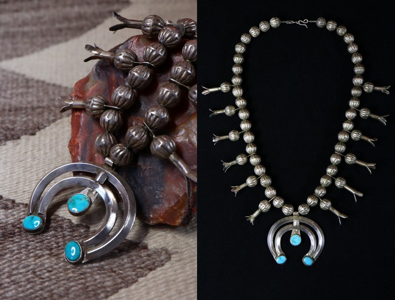 【NAVAJO】ナバホのビンテージジュエリー、伝統的でオーセンティックな造形をベースにした比較的控えめなボリューム感の作品。3か所にマウントされた美しいブルージェムターコイズも大変印象的なアンティーク/ビンテージスカッシュブロッサムナジャネックレスです。
