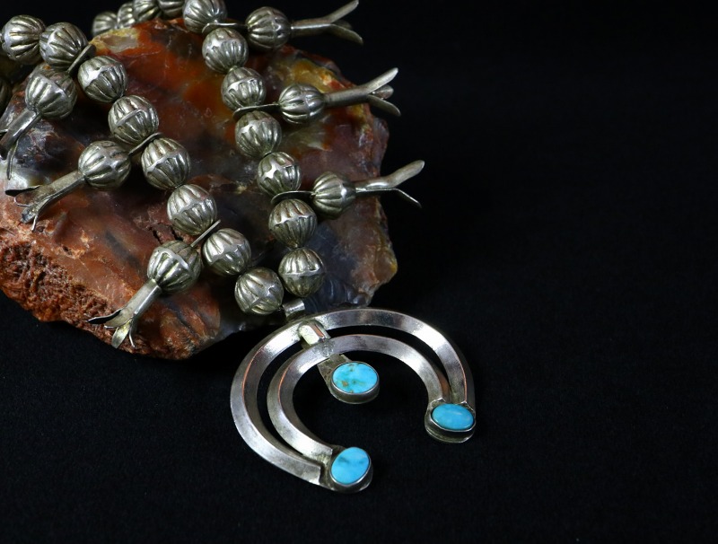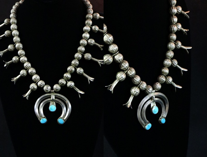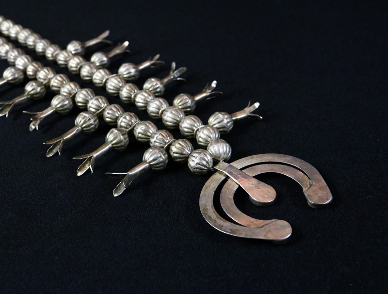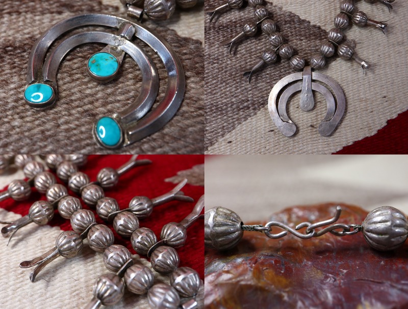 このようなシルバービーズは、現在では限られた作家しか作らないベンチメイド(ハンドメイド)によって構成されています。完全なハンドメイドのビーズは、材料の加工からの全ての工程を手作業により作り上げられており、コンチョを作るような手法で半球体(シェルコンチョ)を制作し、それらを二つロウ付けすることでビーズに成形しています。そのため、その形状や大きさは不均一ですが、独特の味わいが感じられます。 そこにスカッシュブロッサムが左右に6個づつ配されており、シルバーワークには粗暴な部分も見られますが、ナバホジュエリーの力強さとアンティーク作品独特の魅力を宿した作品です。