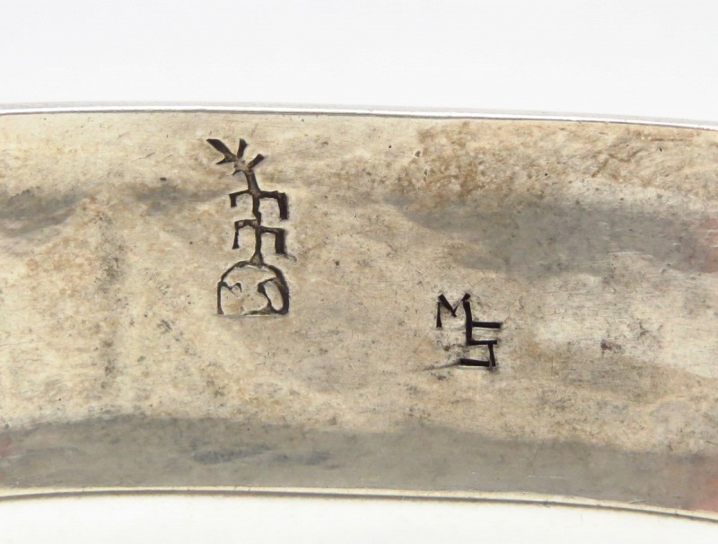 【Michael Sockyma】マイケル・ソッキワイマは、1942年にアリゾナ州ホートビラに生まれ、クラン(ホピ特有の氏族)はCorn/コーン。MitchellとSteven という有名作家二人を兄弟に持っています。ホートビラの名店であり多くのシルバースミスを育てた『Hopi Crafts/ホピクラフト』で学び、1965年頃からそのキャリアをスタートさせたようです。その後1970年代~1990年代にかけて幾つものショーアワードを受賞した名工の一人となっています。
