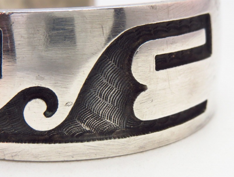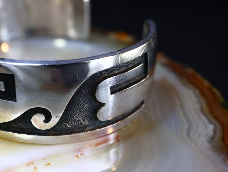 1960年代末頃~1970年代という同作者にとってのキャリア初期に制作されたと思われる作品。オーバーレイ技法によって大胆に紋様が描き出されたバンド(地金)は、現代よりもかなり厚いシルバープレートをカッティングしてオーバーレイされており、厚く重いバングルに仕上げられています。このようなディテールはカッティングに大変な手間がかかり、古いオーバーレイ作品の特徴といえるディテールとなっています。また、ハンマーワークによって全体に柔らかなアールがつけられることで、微妙な立体的と曲線・曲面が与えられ、美しい造形美と腕になじむ上質感を感じさせます。このようなディテールは、木(丸太)に彫り込んだ溝に、タガネを使い地金を沿わせるように繊細なハンマーワークによってドーム状の膨らみを作り上げています。高度な技術と手間を必要とするため、現在ホピの作品ではあまり見ることが出来なくなりました。シンプルで素朴な印象となってますが、ホピのトラディショナルなスタイルを守ったデザイン/造形でありながら細部には作者の高い技術やこだわりがうかがえます。