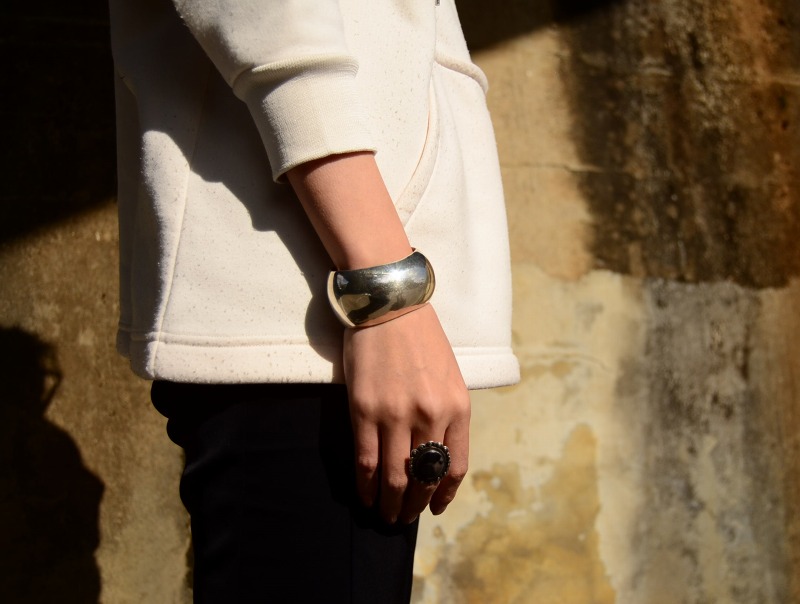 ワイドな幅と共にボリューム感のある作品であり、際立った存在感を持つバングルですが、プレーンなシルバーのみの構成と洗練された印象はナチュラルに馴染みやすく使いやすい印象を持っています。ワイルドなスタイルにもシックな雰囲気にもフィットする作品です。