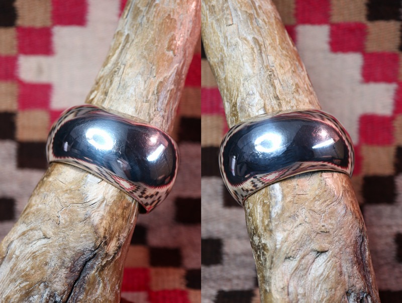 柔らかな曲面でボリューム感のあるシェイプが中空構造によって造形されています。中空となっていますが38g程の重量があり、心地よい重量感が与えられています。このような造形は『Hollow Style』ホロウ スタイルと呼ばれ、2本のバンド/地金を用意し、表になる方をハンマーワークによってドーム型に成形します。それら2本をバングルの丸い形状に整えてからロウ付けにより接着しています。柔らかいドーム型の曲面がつけられたそのフォルムはとても美しいボリューム感を持ち、手首に対するフィット感も素晴らしいバングルです。