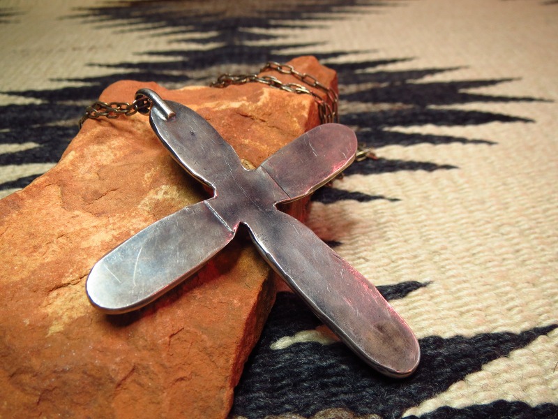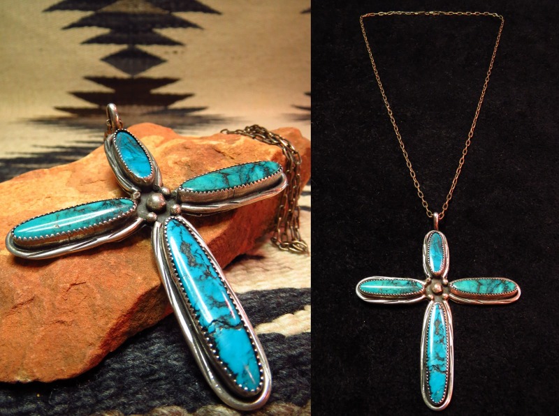 ナバホの作品で、素晴らしいブルーダイヤモンドターコイズがセットされたビンテージクロスフォブネックレスです。