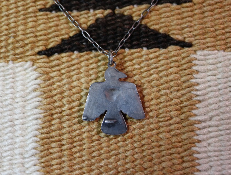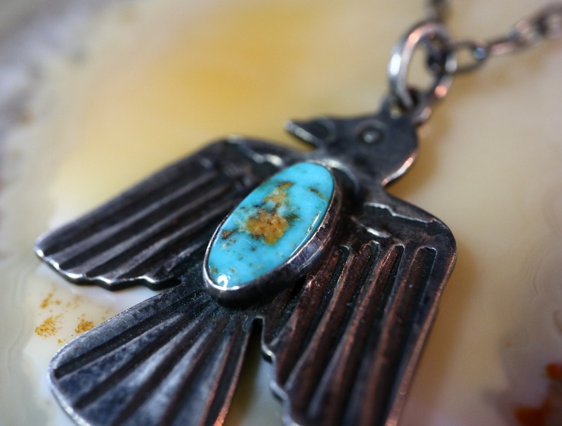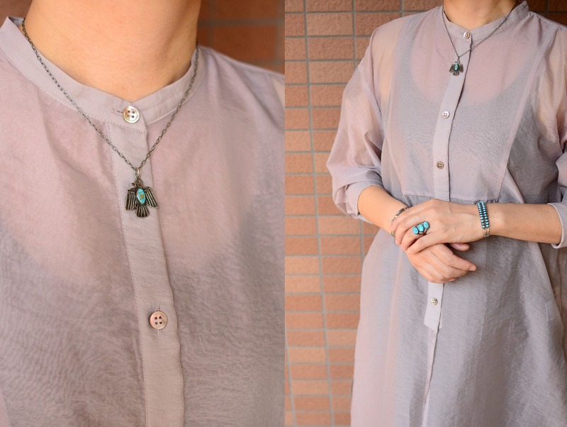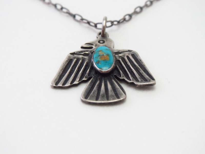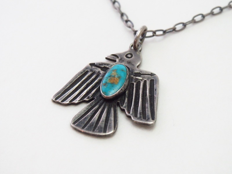 サンダーバードのモチーフはキャッチーでポップな印象ですが、上質なターコイズがジュエリーとしての奥行きを与えており、ビンテージ特有の質感等もあってクラシックで渋い雰囲気となっています。また、比較的小さいサイズのトップの為、性別を問わず使いやすい印象のネックレスです。