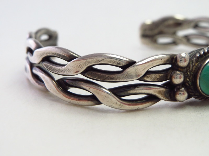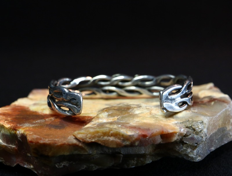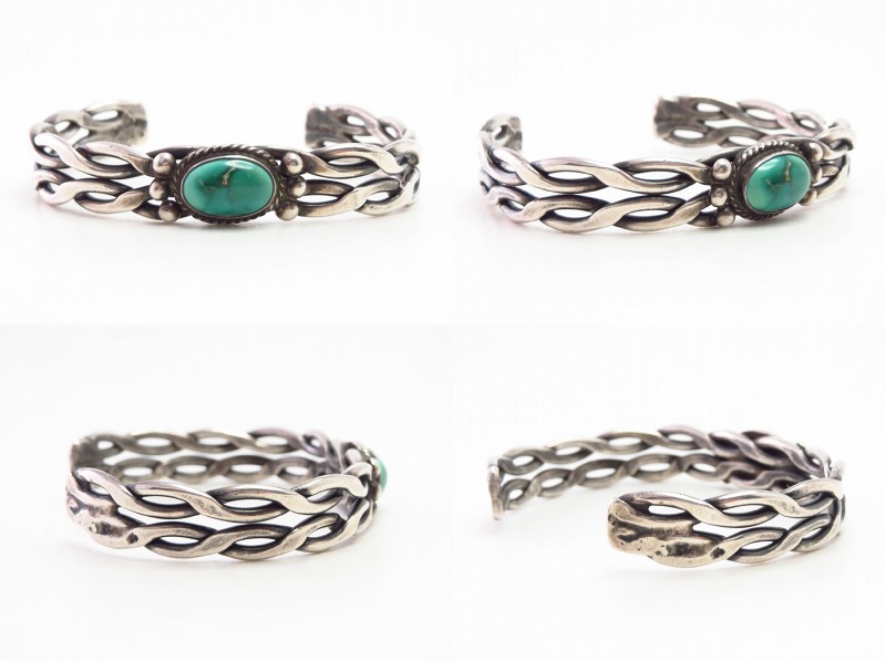 1950年代前後に作られたピースと推測され、インディアンジュエリーの歴史の中でも初期から見られるスタイルの一つであるツイステッドワイヤーの技術を応用した造形となっており、あえて緩くツイストした2本のワイヤーをフラットなシェイプに成形することで、その完成したバンドの表情はチェーンブレスレットの様にも見えるディテールとなっています。さらに、それらを上下2連に重ねてバンドを作り上げており、スタンプワークは刻まれていませんが、奥行きと立体的なボリューム感を持った造形となっています。
