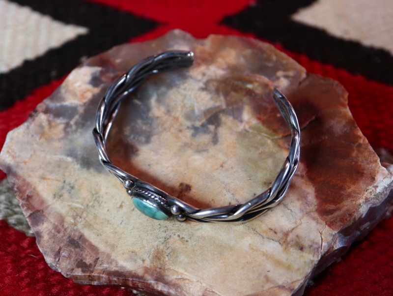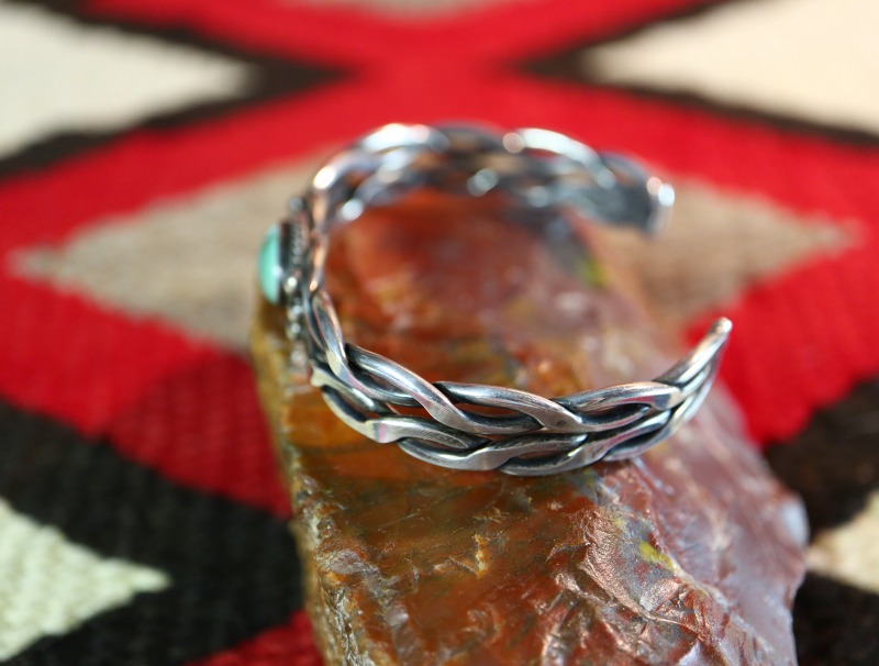 さらに中央には、静かで優しい印象のグリーンターコイズがマウントされ、そのベゼル(覆輪)にはツイステッドワイヤー、そして両サイドにはレインドロップとも呼ばれるシルバーボールが配されることで、ナバホジュエリーらしい表情と独特な上質感を持ったブレスレットに仕上げられています。