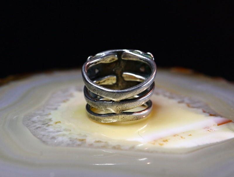 1900年代~1910年代頃に制作された作品と思われ、インゴットシルバー(銀塊)から成形されたシャンクは、丁寧に造形された3本のワイヤーを重ねて構成されています。また、それらはフェイスと内側でロウ付けされており、フロントに向けて幅が広く造形されています。