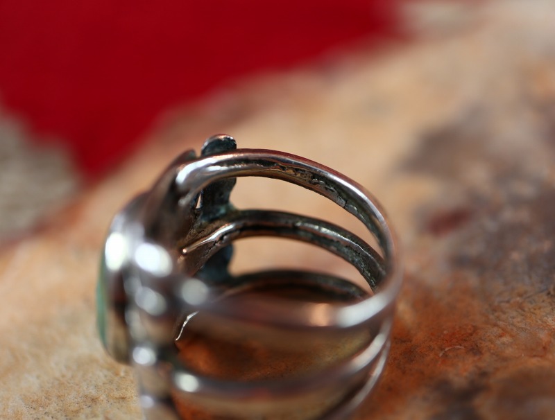本作の様なリングは、アンティークインディアンジュエリーの中でも着用による劣化や紛失、シルバーのリサイクル等によって現存数が非常に少なくなっています。こちらもターコイズにはクラックが見られますが、重厚で堅牢なシルバーワークで仕上げられていることによって、現在に至るまで破損せずにしっかりとジュエリーとして形を留めており、石もクラックはありますがガタツキ等は無く、着用に不安のないコンディションとなっています。