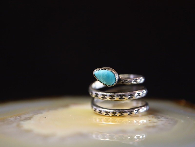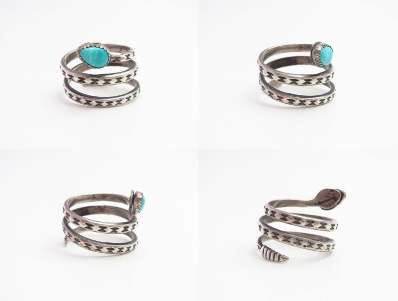 そして、蛇の頭部はティアドロップ型にカットされたターコイズによって表現されており、その秀逸なデザインと共に澄んだターコイズの表情によってアニマルモチーフのキャッチーな雰囲気を上質でクラシックな印象に昇華しているようです。石を留めるベゼル(覆輪)は、ベゼルカップと呼ばれる量産パーツが使用されており、キャスト成形されたシャンクを含め、マシン&ハンドメイドのハイブリッドなピースとなっています。また、ある程度量産されたピースではありますが、現在では現存数の少ない貴重な物となっています。