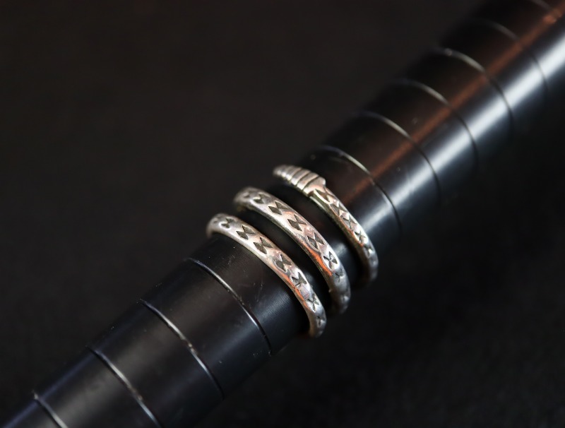『STERLING』の刻印については、銀含有率92.5%の地金であることを示す表記であり、1930年代中頃には登場していた刻印です。ただし、ショップやトレーディングポストにおいて多用されるようになったのは戦後である1940年代末以降のようです。1940年代以前に作られたツーリストジュエリーでも散見されますが、第二次世界大戦中の銀の不足が影響したと推測され、1940年代末以降の作品で非常に多くみられるようになりました。『925』の表記も同じ意味を持っていますが、925の刻印はインディアンジュエリーにおいては非常に新しく採用された刻印であり、そのほとんどが1990年代以降の作品に刻印されています。