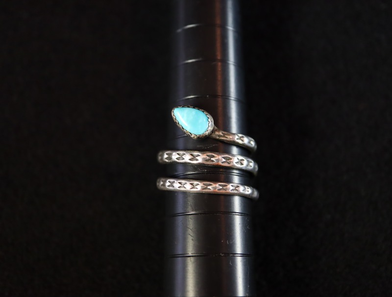 また、このようなラトルスネークが巻き付く造形は、ヨーロッパのアンティークジュエリーなどでも見つかるクラシックで根源的な美しさを持ったデザインであり、ナバホの偉大な作家【Fred Peshlakai】フレッド・ぺシュラカイ(1896-1974)も制作した造形の一つとなっています。そのような歴史や偉大な作品群を踏襲した本作は、【Tourist Jewelry】ツーリストジュエリーや【Fred Harvey Style】フレッド・ハービースタイルと呼ばれる観光客向けに作られたものですが、その高い完成度や普遍的な造形美を受け継ぐリングに仕上げられています。