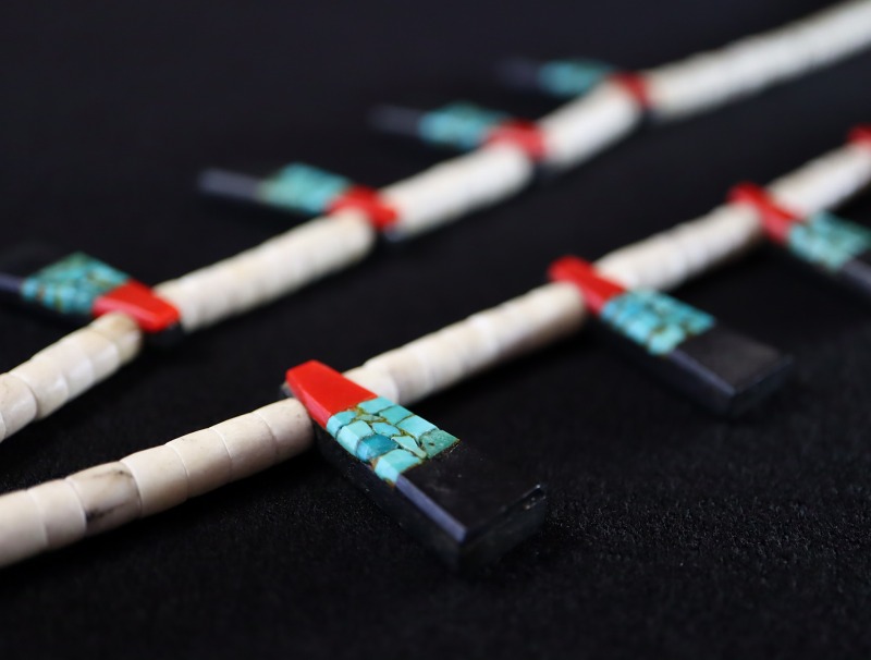 【Chip Inlay/チップインレイ技法】は、破砕タイルの様に細かく砕いたターコイズ等のチップ/欠片を樹脂を使用した象嵌細工に属する技術です。インディアンジュエリーにおいては、1930年代以前のからみられるもので、前述の通り、古くは本作のようなバッテリーバードネックレスなどに用いられています。破砕タイルのように細かくランダムに破砕された石がはめ込まれることにより、複雑で奥行きのある表情を作り上げています。