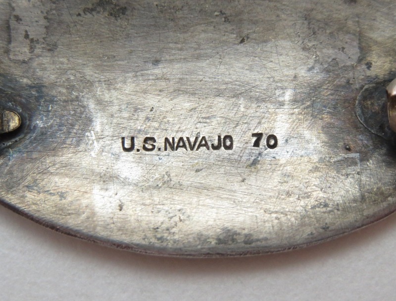 さらに特筆すべきは、これだけ有名作家が揃っていながら【NAVAJO GUILD】のジュエリーとして制作されるものは、個人のホールマーク(署名/サイン)が認められていませんでした。そのため、1941年の発足から1940年代の半ばごろまでは、まったくホールマークなどが記載されていないか、1943年まではこちらの作品と同じ『U.S.NAVAJO 70』が用いられています。その後、1940年代後半からは、【Horned Moon】と呼ばれるホールマークが刻印されるようになりました。