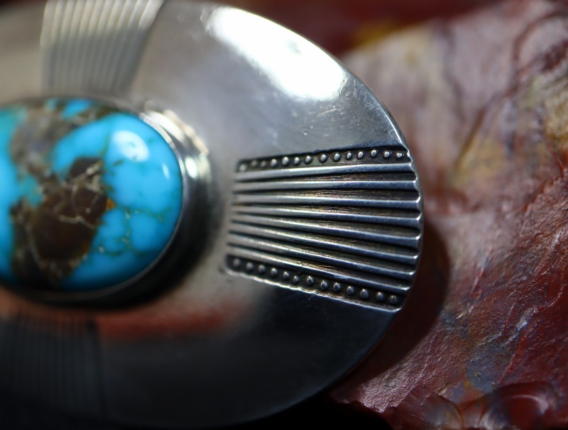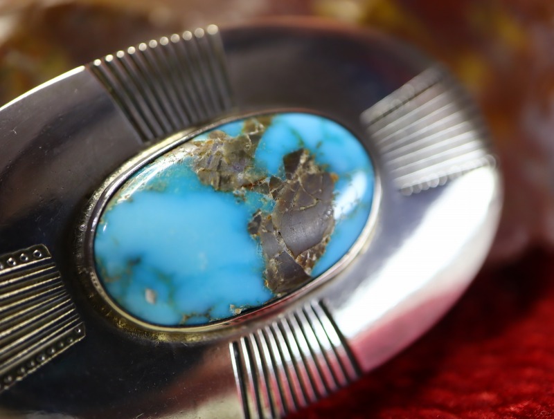 正確な制作背景を特定するのが困難なピースであり、制作された時代も1940年代~1960年代頃まで広く可能性が考えられます。おそらくインゴットシルバー(銀塊)より成形された重厚な地金によるオーセンティックなオーバルシェイプをべースにしています。中央にはワイルドで美しいターコイズがマウントされ、作品にインディアンジュエリーらしい雰囲気が与えられています。