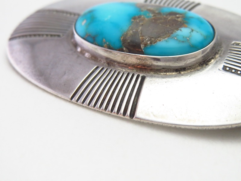 【NAVAJO】ナバホのビンテージジュエリー、クラシックなオーバルシェイプをベースとしたシンプルで美しい作品。クロスデザインを浮かび上がらせる大胆なスタンプワークが特徴的で、シンプルでクリーンなシルバーワークに、ナチュラルでアーシーな表情を持ったターコイズが素晴らしいコントラストを生み出しているハイエンドなビンテージ/アンティークピンブローチです。