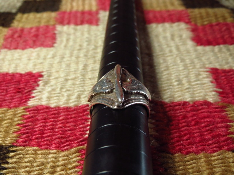 米軍のパイロットがナバホの職人にオーダーしたものと思われ、1940年代~1950年代頃に作られたと推測される作品。ビンテージインディアンジュエリーでも極希に見つかるミリタリーに関連した特殊なピースです。ナバホ族/ディネの人たちも多くが従軍し、主に暗号部隊として活躍した歴史があり、従軍したシルバースミスが自分のために制作したピースである可能性もありますが、おそらくは当時の米国陸軍航空隊や米国空軍士官学校に所属した軍人からのオーダーピースです。