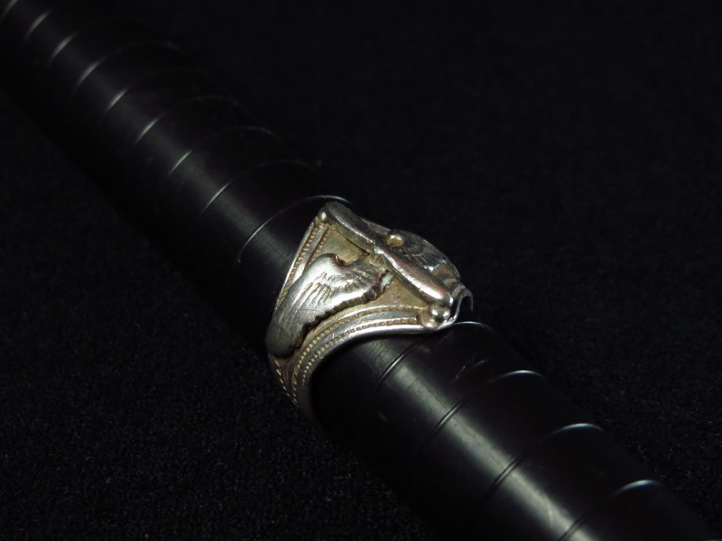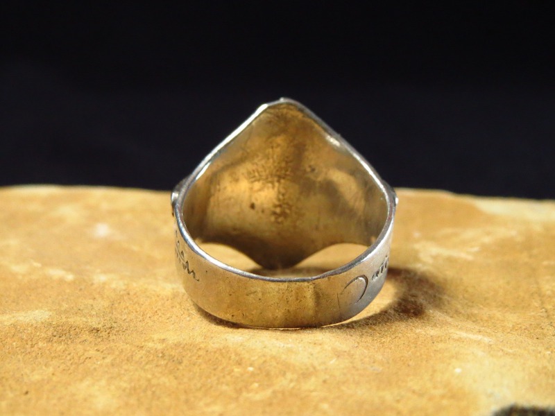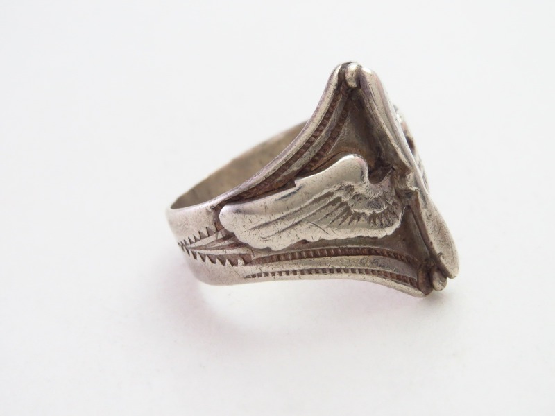 ミリタリー関連のオーダー品と推測され、その特殊性を持ったシルバーワーク、高い史料価値等を含め大変貴重なピースの一つ。ナバホジュエリーの伝統的なディテールとミリタリーエンブレムが高次元で融合され、素朴でクラシックながら洗練された印象も有するピース。指に馴染みが良いシェイプやシルバーのみで構成されたソリッドな雰囲気は、スタイルを問わずフィットするリングとなっています。