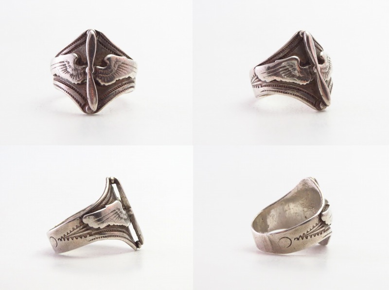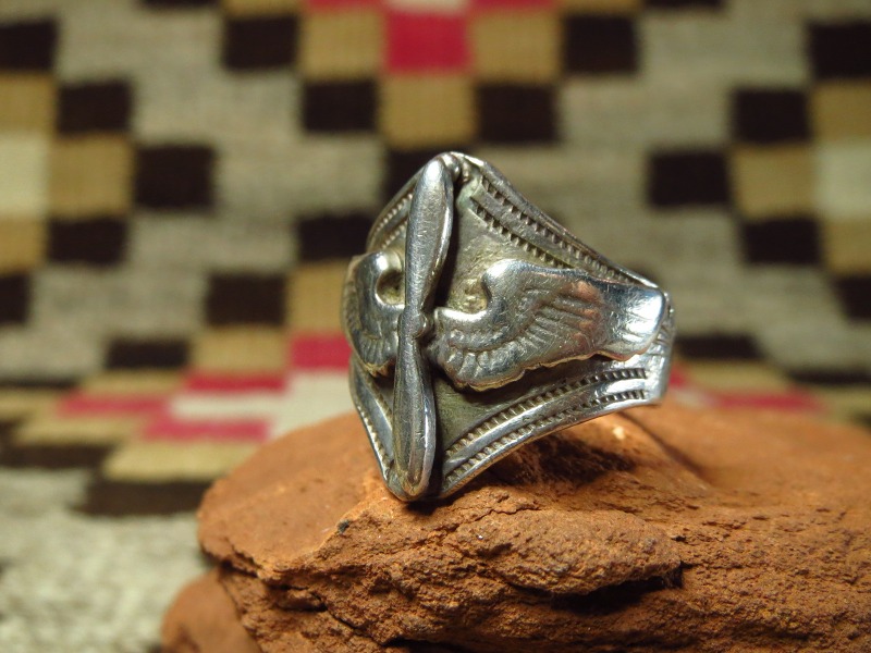 【NAVAJO】ナバホのアンティークジュエリー、なかでも大変希少なミリタリー関連アイテムで【United States Army Air Corps/United States Air Force Academy】米国陸軍航空部/米国空軍士官学校のエンブレムであるプロペラ&ウィングスのアップリケがメインに構成されたメンズサイズのビンテージ/アンティークリングです。