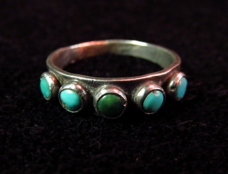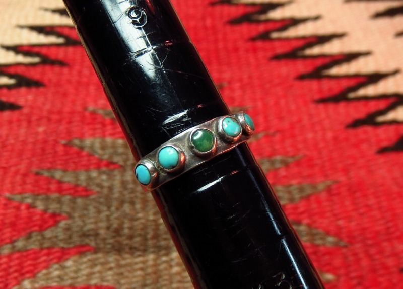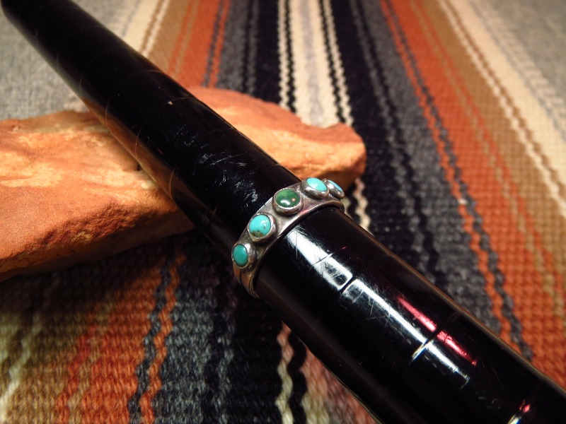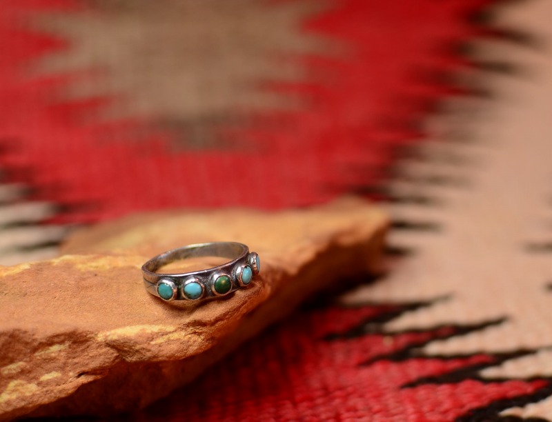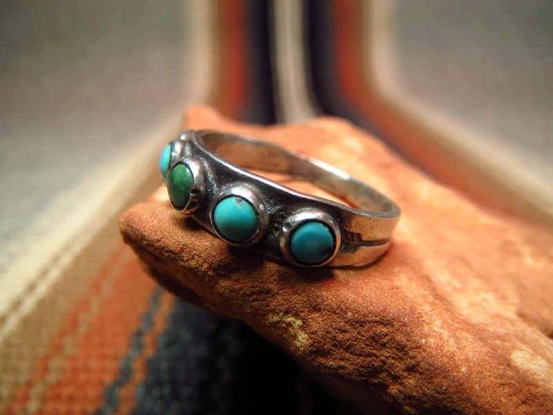 リングでは珍しいマルチターコイズのローワーク(石が羅列されたデザイン)の作品で、スネークアイと呼ばれる小さなラウンドカットターコイズがセットされた繊細なピースです。