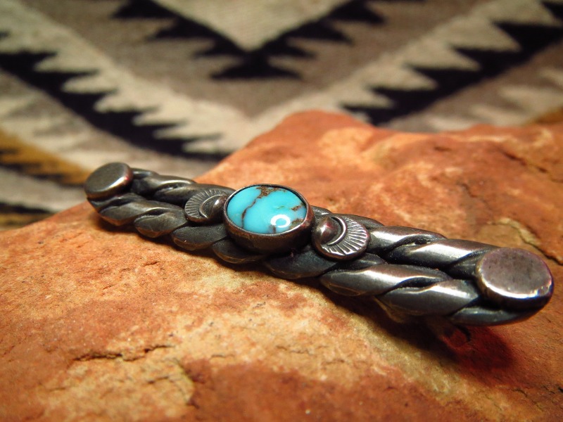 【NAVAJO】ナバホ族の1940年代~60年代頭頃に作られたと思われる古いビンテージ、ピンブローチです。 ツイステッドワイヤーのベースに小粒ながら美しいターコイズ、ごく小さなコンチョなどが施された繊細な作品です。