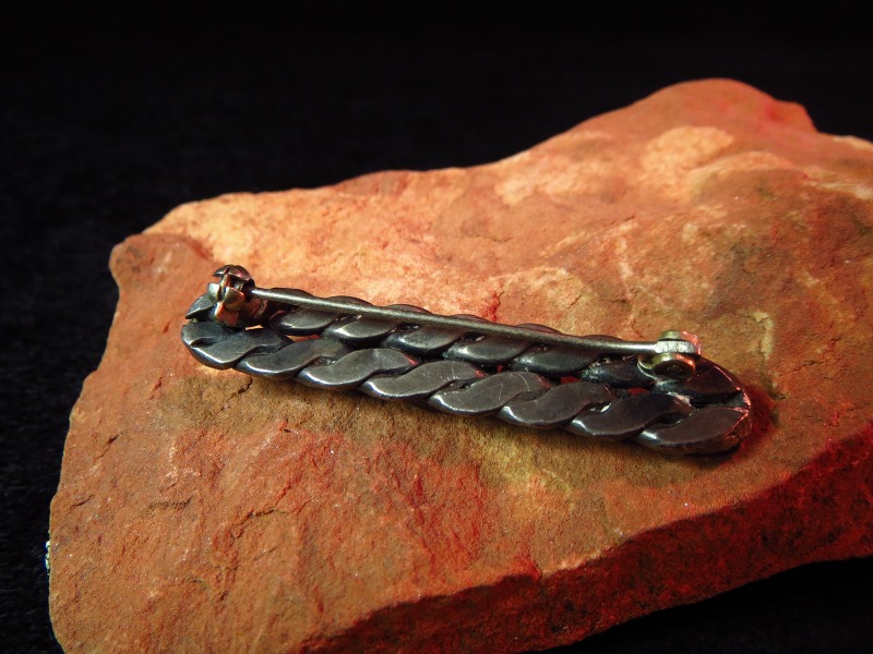 小ぶりなサイズとシンプルな作りですが、黒っぽいシルバーの表情や美しいターコイズはハットピンやラペルピンとして味のある良いアクセントになります。