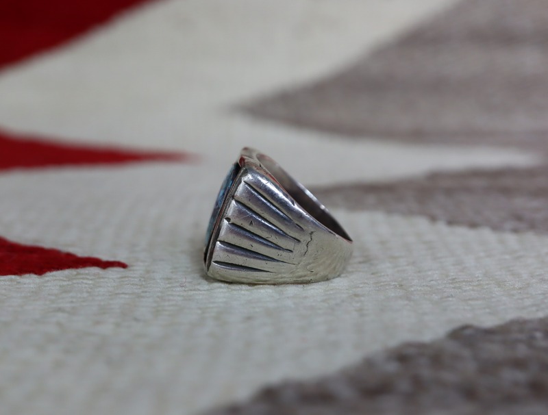 【NAVAJO】ナバホの巨匠【Fred Thompson】フレッド・トンプソン(1921or1922-2002)の作品、ボックス構造を応用した造作によって形作られ、シンプルながら同作者の技術や感性が感じ取れるアンティーク/ビンテージリングです。リペア跡が大きく入りながらも美しいナンバーエイトターコイズを際立たせ、使用感の有るコンディションながら、質実剛健な造りによってまだまだ今後の着用にも全く不安を感じさせない作品となっています。