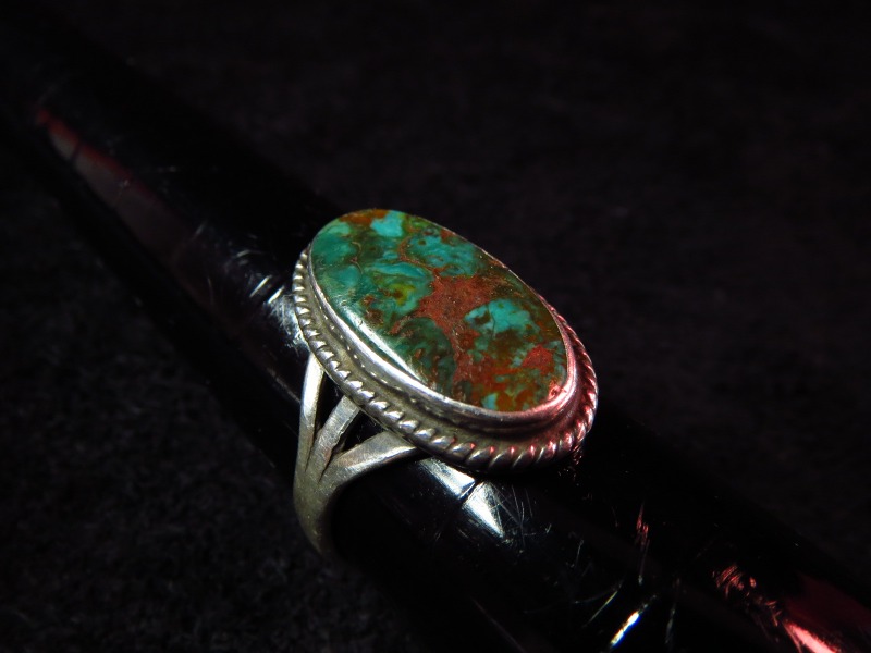 非常にトラディッショナルなナバホのスタイルで希少なメンズサイズの作品。インゴットより成形されたしっかりとしたスプリットシャンクに、美しいオーバルカットターコイズの存在感を活かしたデザイン・造形です。ベゼルにはツイステッドワイヤーが施されています。