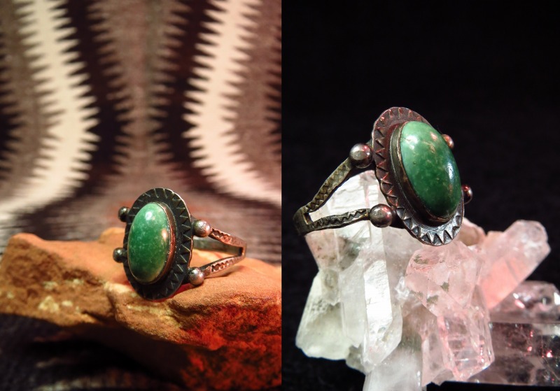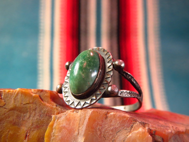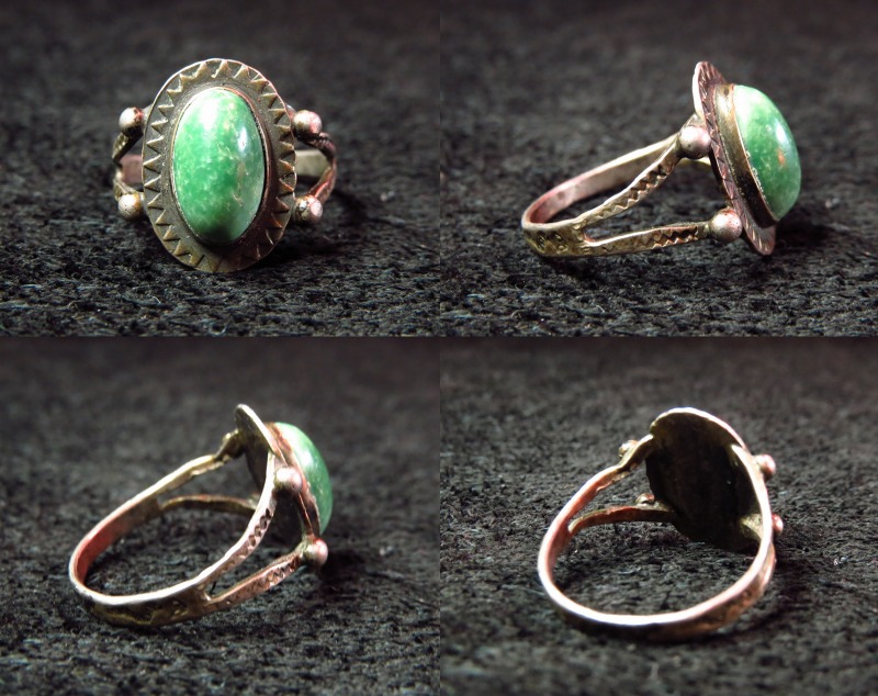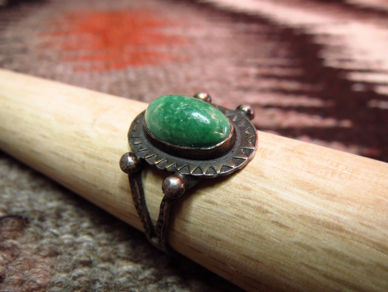 造形はトラディッショナルなナバホのオールドスタイル。スプリットワイヤーの繊細なシャンクはセンターに施されたコンチョとの接地部分にシルバードロップが施されており、とてもシンプルながら秀逸なデザインで、センターのコンチョはエッジにトライアングルのスタンプが施されています。
