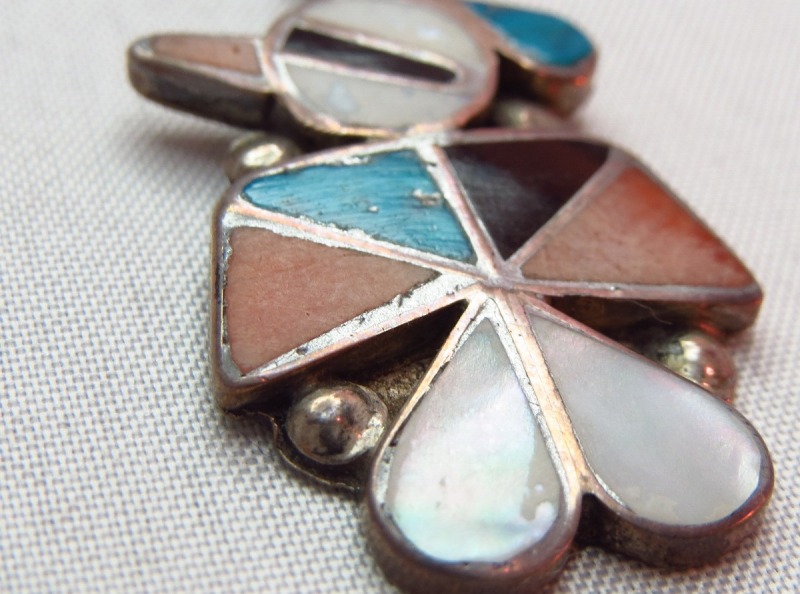1970年代頃に作られた作品で、インディアンジュエリーではとてもトラディッショナルなサンダーバードをモチーフにしたピースで、ズニ独特のインレイ技法を用いてシェルやターコイズ、ジェットなどが螺鈿細工のようにセットされています。
