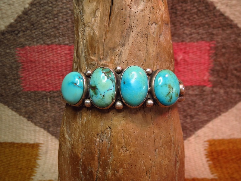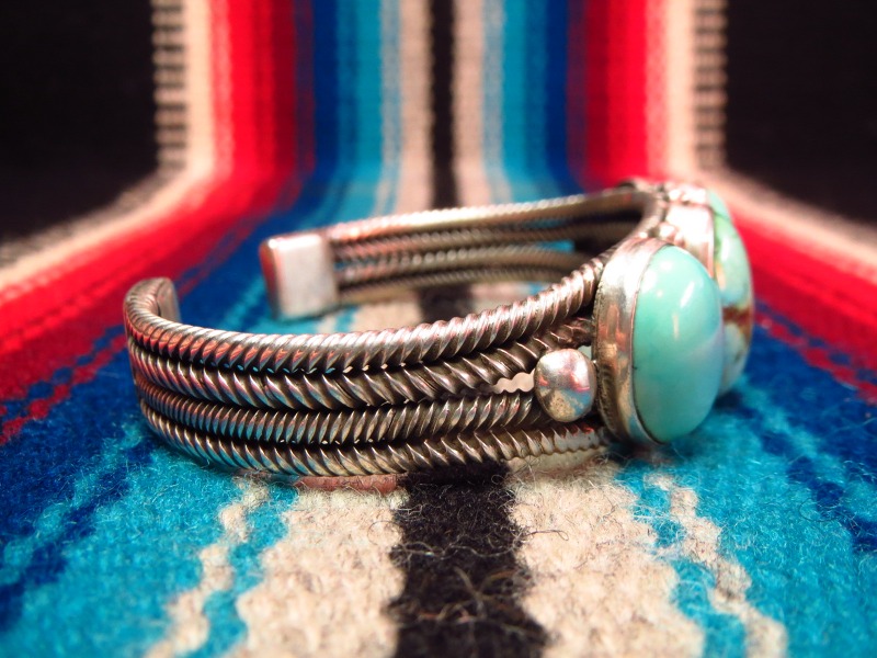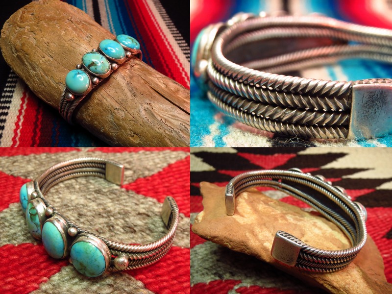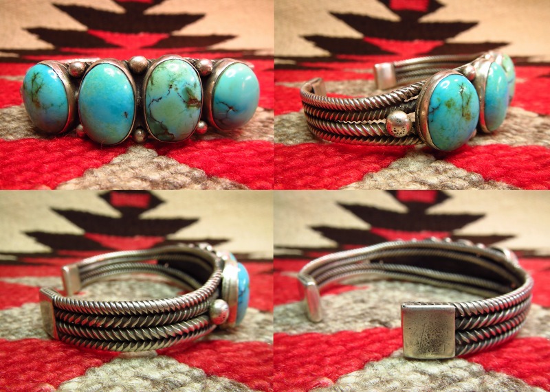 【NAVAJO】ナバホのOLDPAWN、1950年代~1970年代前半頃の作品とおもわれ、美しいツイステッドワイヤーに4つのターコイズがセットされたビンテージバングルです。