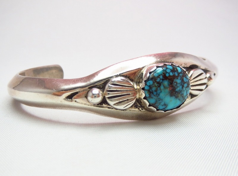 【Cochiti】コチティ族の大巨匠【Joe H. Quintana】ジョー・キンタナ(1915-1991)の作品で、1960年代~1970年代頃に作られたと思われる氏を代表する流麗な造形に素晴らしいターコイズのセットされたバングルです。