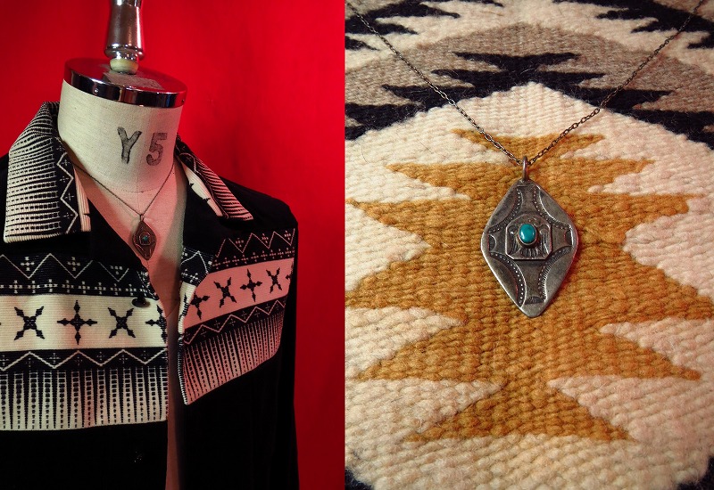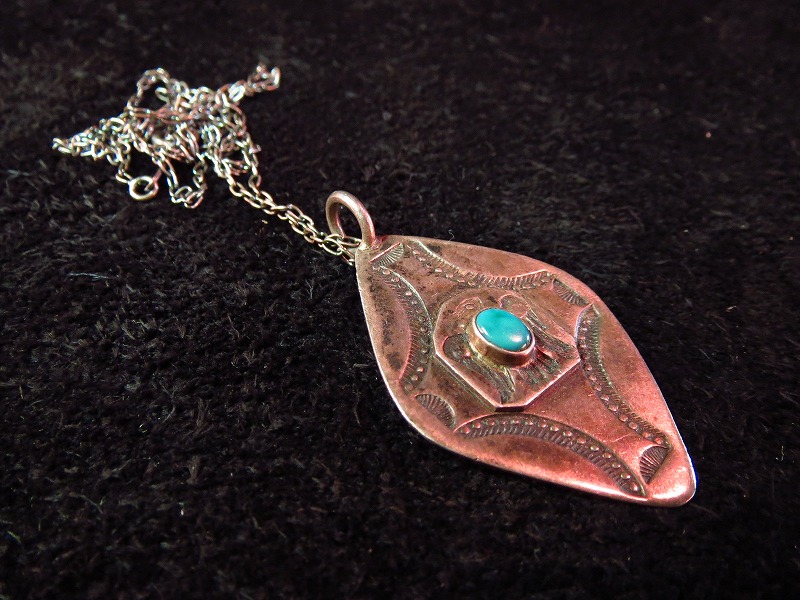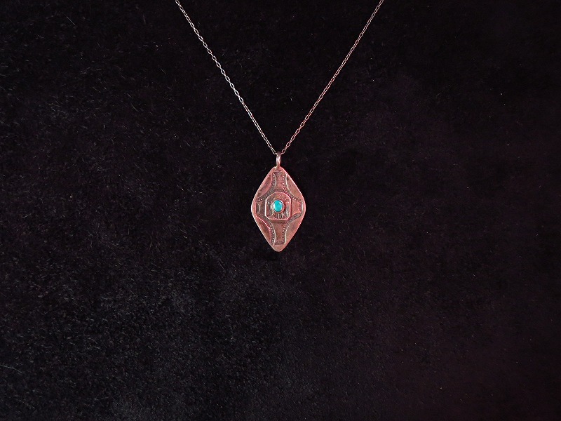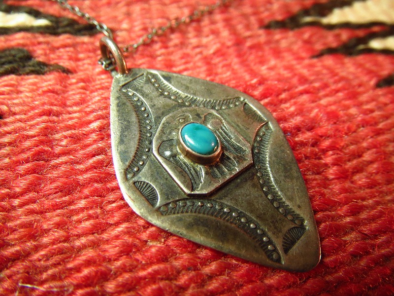 ナバホのサンダーバードスタンプにターコイズがセットされたネックレスです。菱形のシェイプにクロス状のスタンプが施された珍しいトップです。