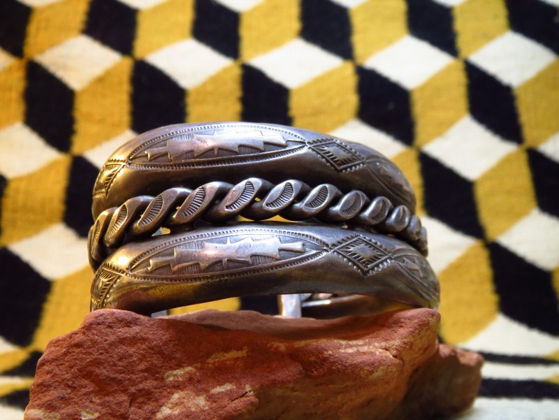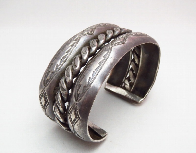 【NAVAJO】ナバホのアンティークジュエリー、ツイステッドワイヤーを挟む3連に構成され、ワイドで迫力のある作品。 素晴らしいシルバーワークにより重厚で武骨な印象に仕上げられたハイエンドなアンティーク/ビンテージバングルです。