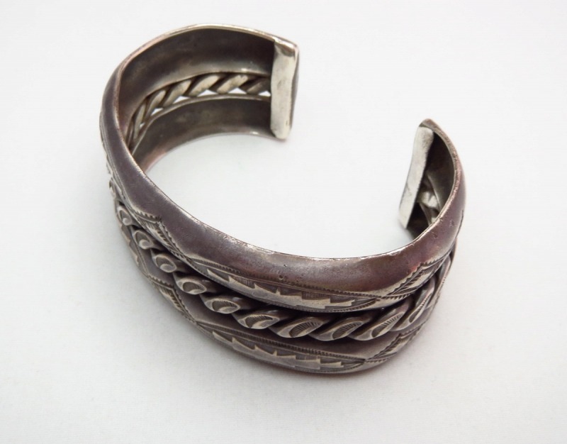 アンティーク/ビンテージインディアンジュエリーの中でも幅があり、ワイルドで迫力のあるバングル。渋く重厚なシルバーの質感や、力強い造形は男性的な印象ですが、丁寧なシルバーワークや美しいスタンプワークによりクラシックでエレガントな印象も持つ作品です。史料価値も高いピース。