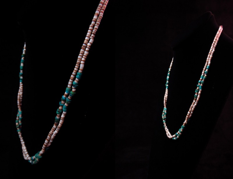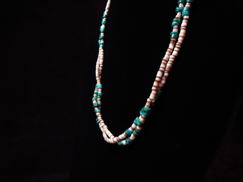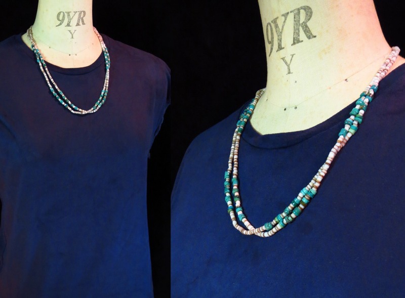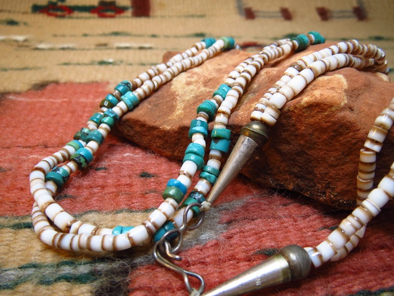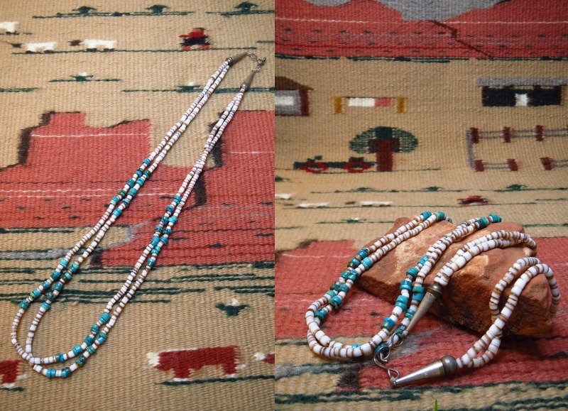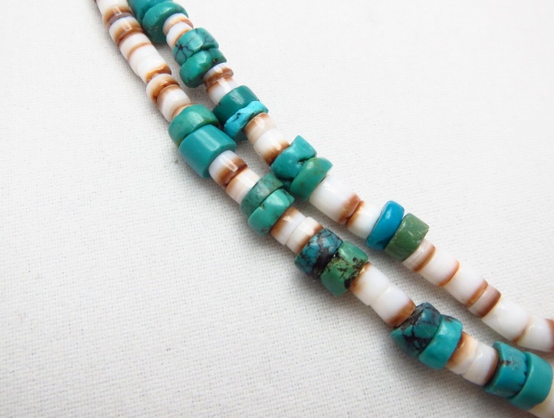 【NAVAJO】ナバホか、【PUEBLO】プエブロのトラディッショナルな作品で、シェル(貝)とターコイズで構成された2連【Heishi】ヒシネックレスです。