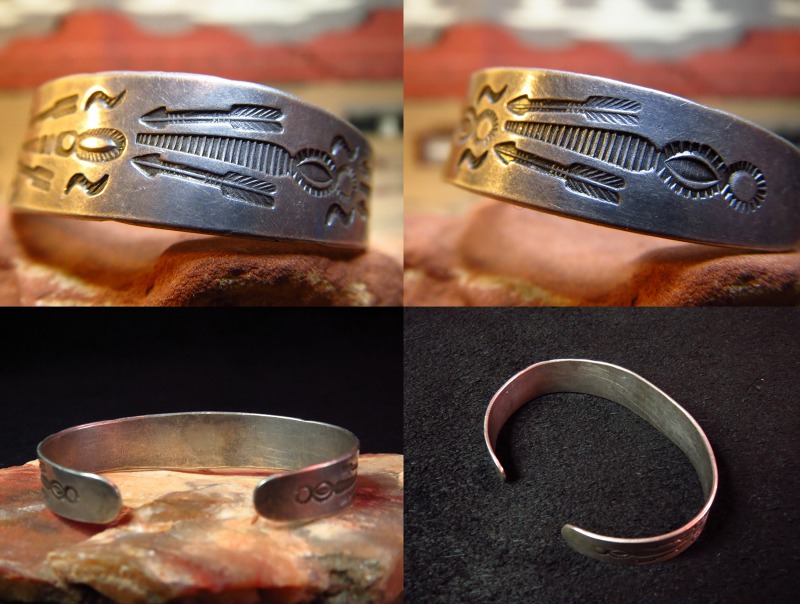 INGOT(銀塊)からハンマーで成形されたシルバーベースは薄く仕上げられていますが、とても美しいスタンプワークが施され、アンティークナバホジュエリー独特のソリッドで無駄のない完成度を持った作品です。