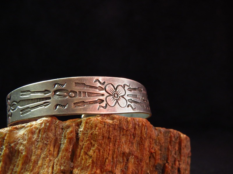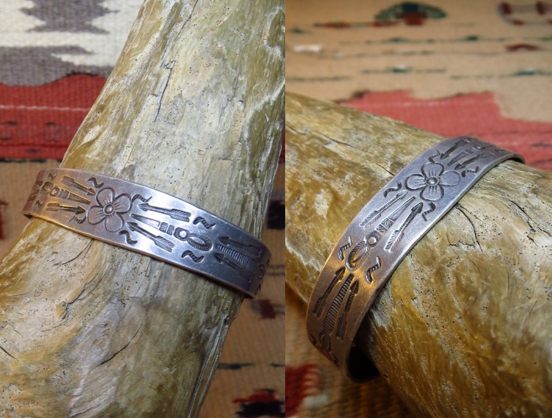 【NAVAJO】ナバホのアンティーク作品で、ツーリストジュエリーと呼ばれる観光客向けに作られたピースの初期作品。 センターにフラワーモチーフのスタンプワークが施され、ポップなデザインですが、サイドからターミナルにかけて施された美しいスタンプの数々は、アンティーク独特の威厳を感じさせるアンティーク/ビンテージバングルです。