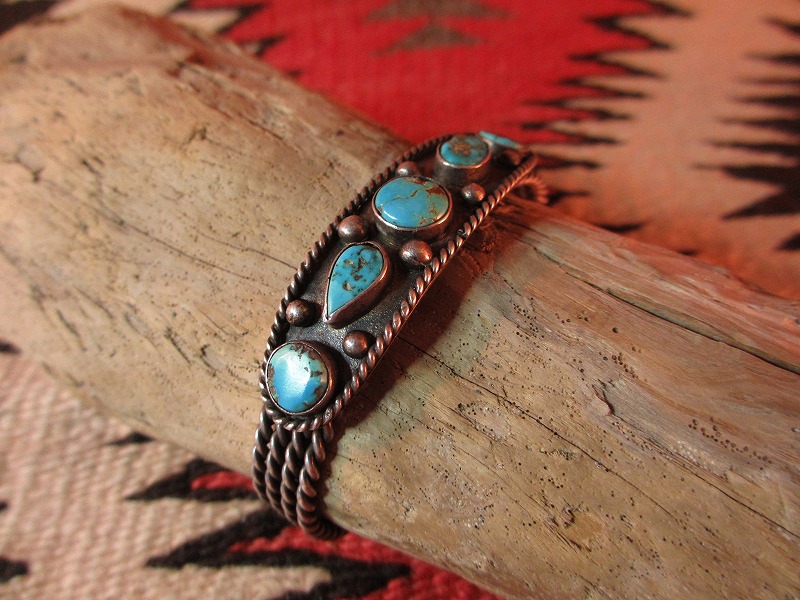 1920年代後半~40年代頃のとても古い時代に作られたアンティークインディアンジュエリー作品です。4本のツイステッドワイヤーをベースにターコイズが羅列されたローワークデザインがオーセンティックな印象の作品。
