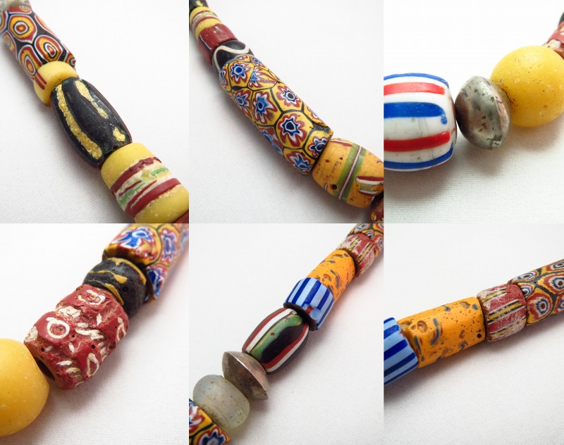 こちらのネックレスでは、古代に作られたビーズは含まれておらず、多くは1800年代後期~1900年代初頭のアンティークトレードビーズにより構成されています。リプロダクトのビーズは含まれていないようですが、コンディションを含め玉ごとに製造年代や産地はバラバラで、おそらくはほとんどがアフリカを経てアメリカに渡ったものと思われます。