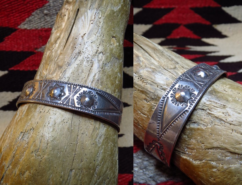 【NAVAJO】ナバホのアンティークジュエリー、1910年代後半~1920年代製と思われる古典期に近い時期の作品で、インゴット(銀塊)から成形されたベースのセンターに、3つのリポウズが施されたアンティーク/ビンテージバングルです。