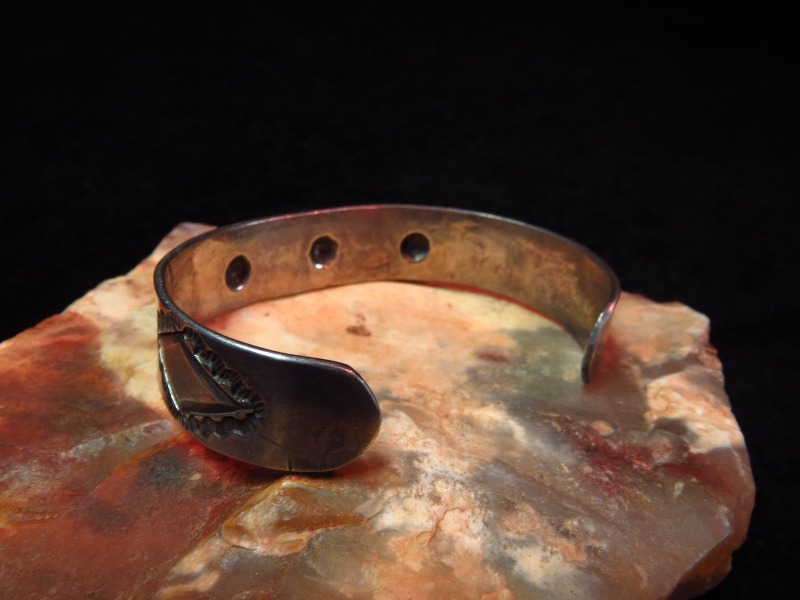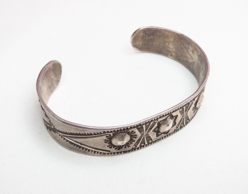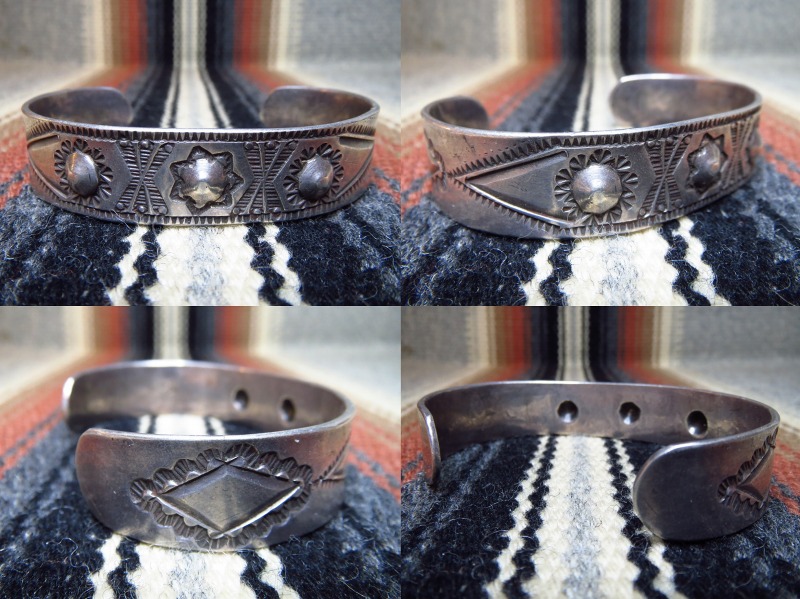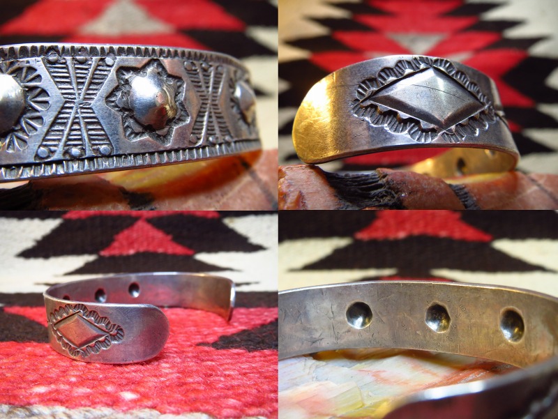 大変古い作品ですが、非常に美しいスタンプは特筆すべきディテールであり、特にフロント部分のデザイン/造形は大変クラシックで威厳のある表情でありながら、現代的な印象を受けます。 対して、サイドに施されたスタンプワークは、フロントに共通したスタンプ(鏨)ながら、とても素朴でアーリーナバホの味わいを持っています。