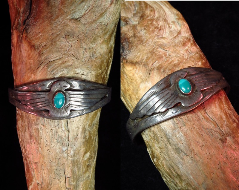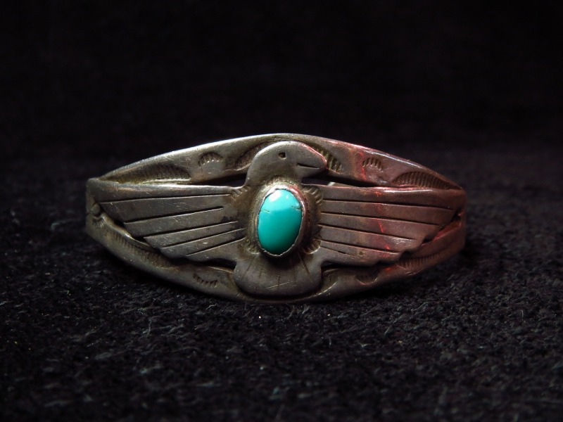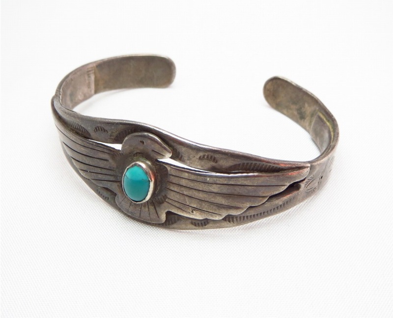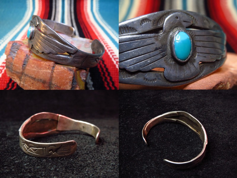 【NAVAJO】ナバホのアンティークジュエリー、センターにサンダーバードのアップリケが施され、ツーリストジュエリーと呼ばれる観光客向けにデザインされたものと推測されますが、量産化された所謂フレッド・ハービースタイルのピースではなく、インディアンシルバースミスによって製作されたオリジナル作品。