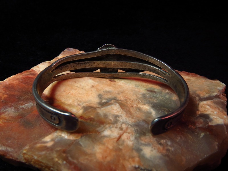 こちらもキャッチーでどこか可愛らしい印象を持ったサンダーバードが特徴的なバングルであり、とても味わい深い作品です。 また、ポップでキャッチーな印象とともにアンティーク独特の質感とインゴットから成形されたシルバーの重厚感は、チープな印象を作らずに、男性のスタイリングに良い『ギャップ』と深みを与えてくれると思います。