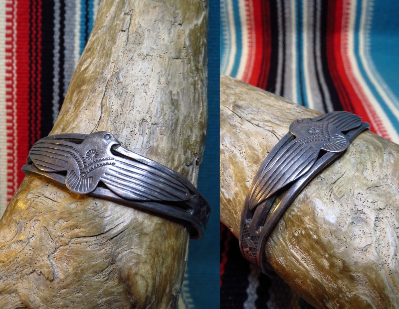 【NAVAJO】ナバホのアンティークジュエリー、センターにサンダーバードのアップリケが施され、ツーリストジュエリーと呼ばれる観光客向けにデザインされたものと推測されますが、インゴット(銀塊)から成形された風格のある作品で、量産化されたフレッド・ハービースタイルのピースではなく、インディアンシルバースミスによって製作されたオリジナルのアンティーク/ビンテージバングルです。